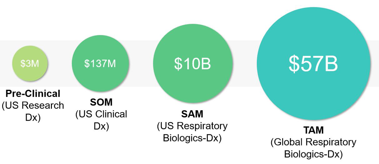 Within this landscape, the Serviceable Addressable Market (SAM) is estimated at $10 billion for U.S. respiratory biologics, reflecting the portion of the market currently accessible through existing infrastructure, payer coverage, and prescriber adoption. The Total Addressable Market (TAM), encompassing the global biologics market across key regions including the United States, EU5 (UK,FR,ES,IT,DE), China, and Japan, is projected to exceed $57 billion.