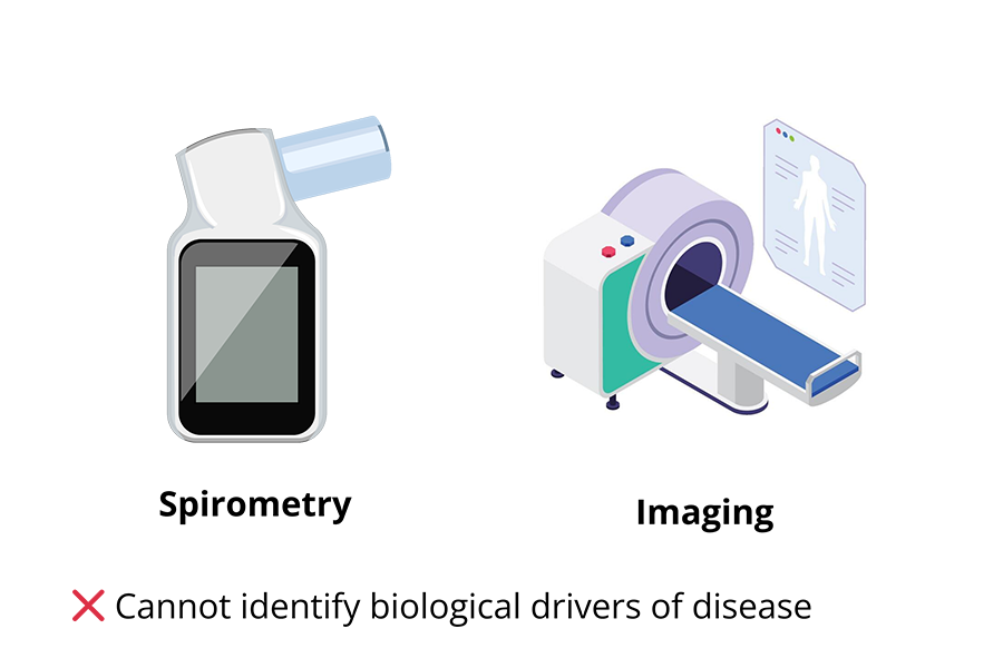 Conventional tools like spirometry and imaging detect structural or functional changes in the lungs but often miss the underlying biological cause of disease.